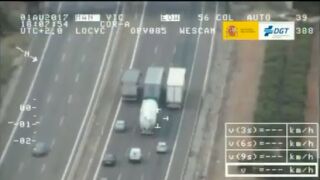 Pegasus, el helicóptero de la DGT, captó a tres camiones adelantándose por una autovía. Sin embargo, uno de ellos estaba infringiendo la ley, ¿sabes cuál es?. Según las normas de conducir, en calzadas de tres o más carriles, camiones o furgones de más de 3.500 kg mma, conjuntos de vehículos de más de 7 metros de longitud y vehículos especiales, solo pueden adelantar por el carril inmediato al de la derecha.