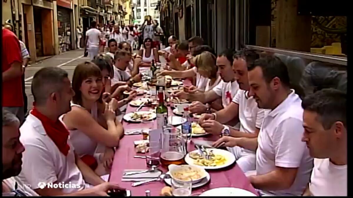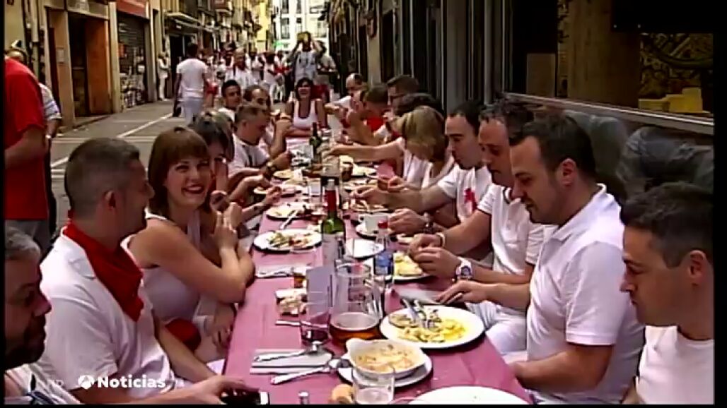 En Pamplona es tradicional que la calle Estafeta se llene el día del chupinazo con un almuerzo tradicional el que las peñas calientan motores a pocas horas de empezar la fiesta de San Fermín.