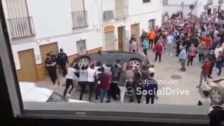 Vecinos de Caseriche vuelcan el coche del clan familiar al que acusan de los robos en la localidad