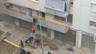 Los vecinos de un barrio de Terrasa, Barcelona, impiden la ocupación de un piso entrando por el balcón con una escalera portátil. Una iniciativa vecinal que trataba de poner fin a la okupación de una vivienda del barrio. Muchos vecinos fueron testigos de lo que ocurrió.