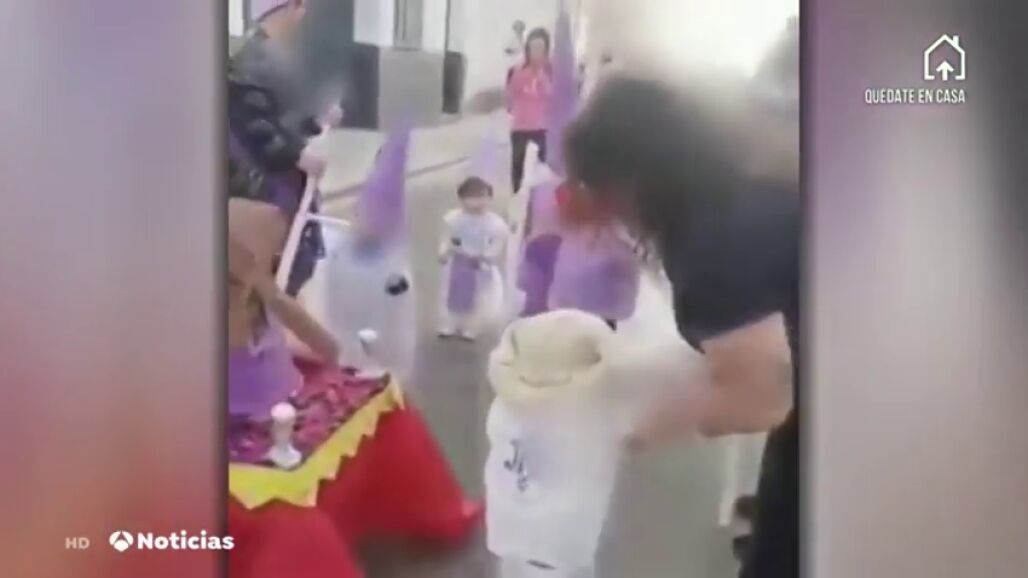 Sin embargo, los vecinos de una calle de Villalba de Alcor, en Huelva, no han querido respetar las normas para evitar la propagación del virus y han organizado una procesión en la que participan niños y mayores. "Mira los costaleros " presumía uno de los adultos al ver a los niños disfrazados de costaleros de la peculiar procesión.