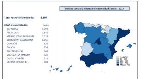 El mayor volumen de delitos contra la libertad e indemnidad sexual se da en Cataluña, Andalucía, Madrid y Comunidad Valenciana, con el mayor volumen.