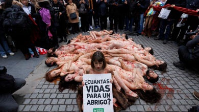 Vídeo: animalistas protestan desnudos y ensangrentados en Madrid para exigir cierre de granjas peleteras