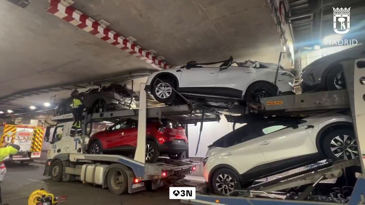Según ha informado Emergencias Madrid, la altura total del conjunto, especialmente por los coches situados en la parte superior del remolque, superaba ese límite, provocando el bloqueo.