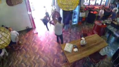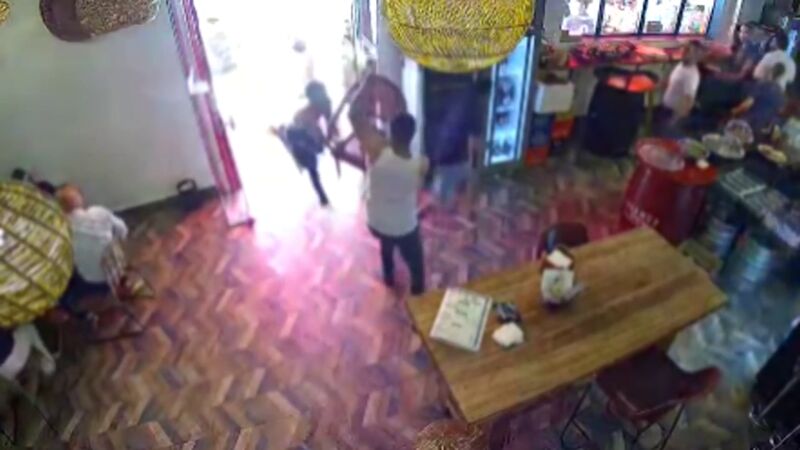 Según se ve en el vídeo los 'gorrillas' llegan a entrar en la cocina donde la cocinera acaba echándolos fuera y recuperando un cuchillo que le habían quitado. Cuando parecía que el follón había pasado alguien desde la calle lanza una botella hacia el anterior.