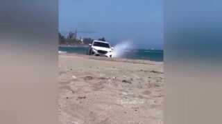 El vídeo, de 16 segundos de duración, no ha tardado en hacerse viral. Muestra a un automóvil circulando a gran velocidad por la orilla del mar ante el estupor de los allí presentes.