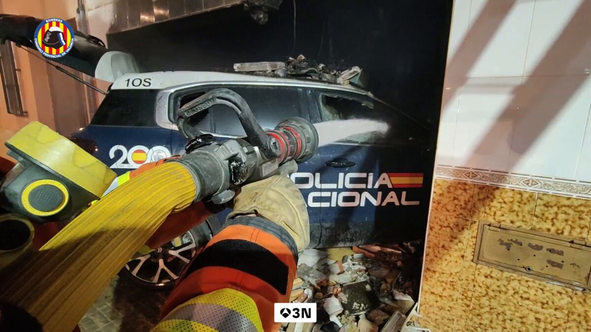 Una persecución policial en la localidad valenciana de Alaquàs ha terminado con un aparatoso accidente después de que un vehículo policial se empotrara contra el garaje de una vivienda y comenzara a arder, generando momentos de gran tensión entre los vecinos de la zona.