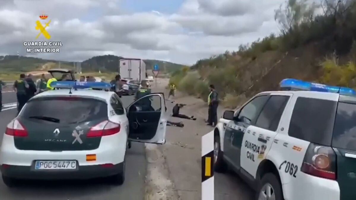 La intervención ha ocurrido en plena A-66 cuando medio centenar de agentes de la benemérita perseguían al vehículo en el que iban los cuatro detenidos. En el vídeo se puede ver como logran detener el coche y un agente, a punta de pistola, les pide que bajen de él.