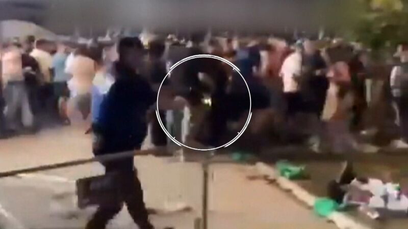 Así detuvieron a uno de los chicos envuelto en una violenta pelea, el arma casi le hace perder hasta los pantalones. Los jóvenes se agredían con correas y barras. Una multitud los rodeaba. Los agentes irrumpieron para frenar esa violenta pelea y uno de ellos utilizó la pistola taser para reducir al joven.