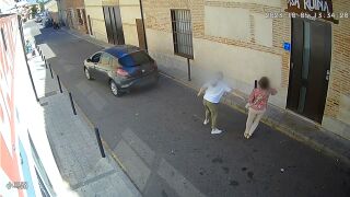 Tras una breve conversación, en el que la presunta agresora cada vez se sitúa más cerca de la víctima, se escucha cómo ésta le pide que la deje tranquila e intenta zafarse de ella. En ese momento se produce el 'abrazo' y la mujer trata de defenderse con la muleta, mientras el vehículo comienza a circular marcha atrás para recoger a su cómplice. Finalmente consigue hacerse con el reloj de la anciana que cae violentamente al suelo. Por suerte no presenta lesiones graves. Tan sólo un golpe en antebrazo y muñeca.