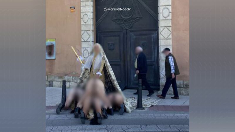 Una virgen subida a cinco hombres desnudos, arrodillados y con sus partes al aire. Todo a plena luz del día y ante la mira de los transeúntes. Eso ha ocurrido en Cuenca, donde seis personas llevaron a cabo una 'performance' artística de tintes religiosos frente a la catedral de la ciudad.