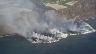 En el vídeo de la noticia se puede observar la imagen aérea de cómo cae la lava hacia el mar. Un fenómeno que ha provocado un "choque térmico" por la diferencia de temperatura.