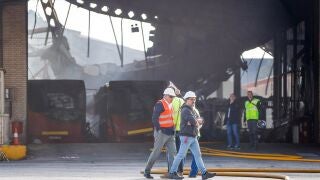 El humo sigue emanando del techo derruido de lo que hasta ayer era una cochera donde dormían los autobuses urbanos de Burgos. Ya no hay nada. Todo ha quedado reducido a hierros y escombros. Donde ahora sólo vemos esqueletos teñidos de ceniza, antes había 39 vehículos listos para dar servicio de transporte a los burgaleses. Son 39 de los 75 autobuses que completan la flota municipal.