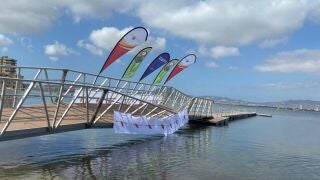 Vuelca una pasarela en La Manga y caen varias personas al agua mientras se hacían una foto