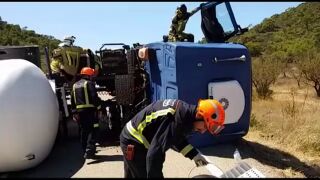 Vuelca un camión cisterna en la carretera de Mequinenza, Zaragoza
