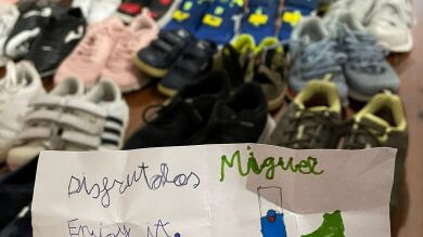 Una de las mayores aportaciones se ha hecho desde un colegio de Pontevedra. Allí los niños han donado calzado que no utilizan y, además, dentro de cada zapatilla han escrito mensajes de apoyo para quienes las reciban. "Disfrútalos. Enjoy it", leemos en una de ellas.