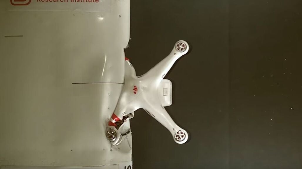 La recreación que se puede ver en el vídeo simula el momento en el que un dron DJI Phantom 2 (uno de los más vendidos del mercado), que tan solo pesa un kilo, impacta contra el ala de una avioneta Mooney M20 a una velocidad de 300 kilómetros por hora.