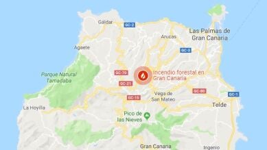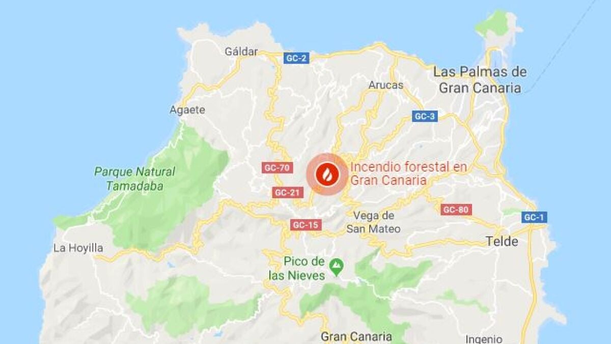 Pero Google Maps tiene también otra función que es señalar dónde hay incendios forestales y su magnitud. El último que indica está situado en Gran Canaria, un incendio que ya arrasa más de seis mil hectáreas y deja a nueve mil personas evacuadas.