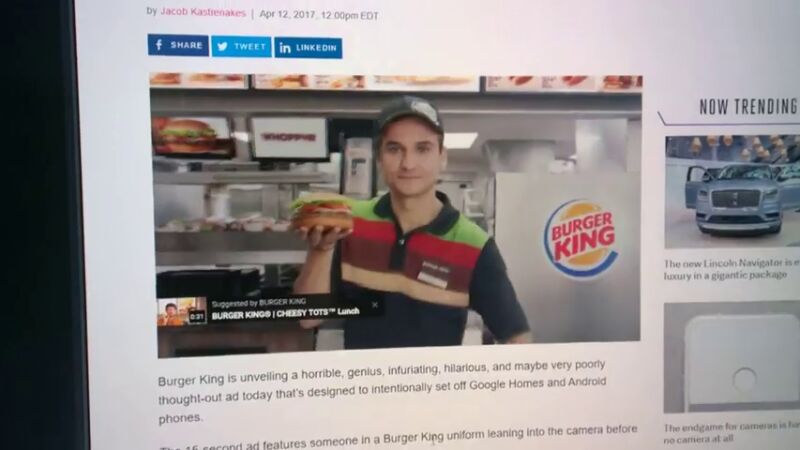 Como el anuncio solo dura 15 segundos, dice el actor, no le va a dar tiempo de decir todo lo que tiene la hamburguesa, así que ha tenido una idea, se lo pregunta a Google. Entonces, en miles de hogares estadounidenses teléfonos, tablets y asistentes virtuales se activaron y empezaron a leer lo que sobre esa hamburguesa dice la wikipedia.