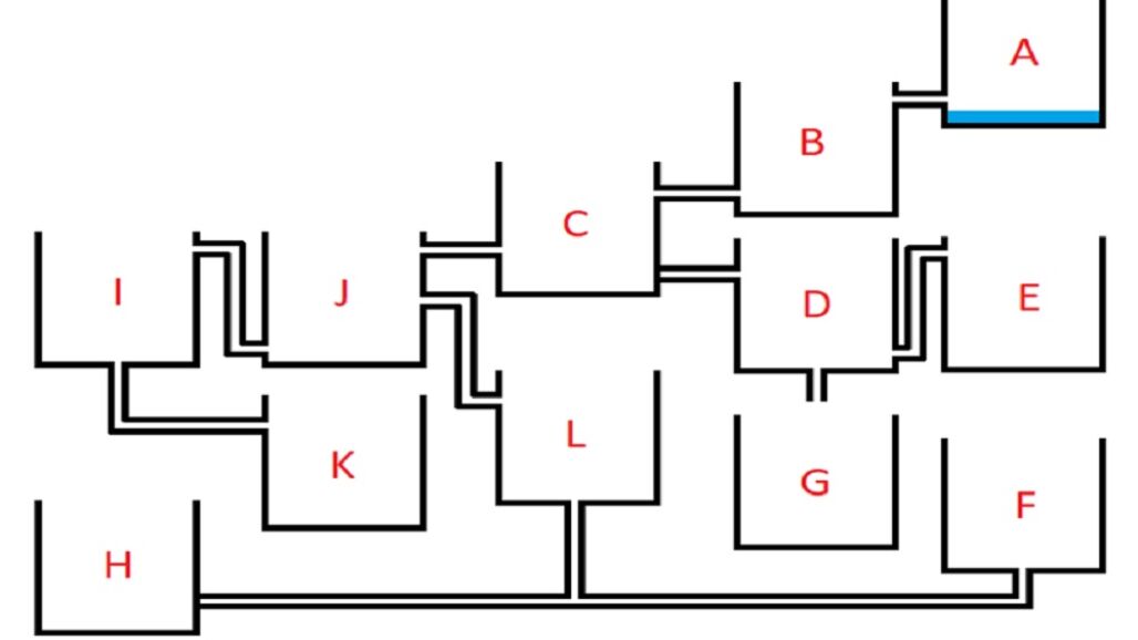 Solución: el depósito que se llena primero es el 'F'. El agua pasa por el depósito 'A', 'B' y 'C'. El tanque 'D' al estar cerrado, hace que el agua siga por el 'J' y el 'L'. Como el 'H' también está cerrado, el 'F' se llena primero.