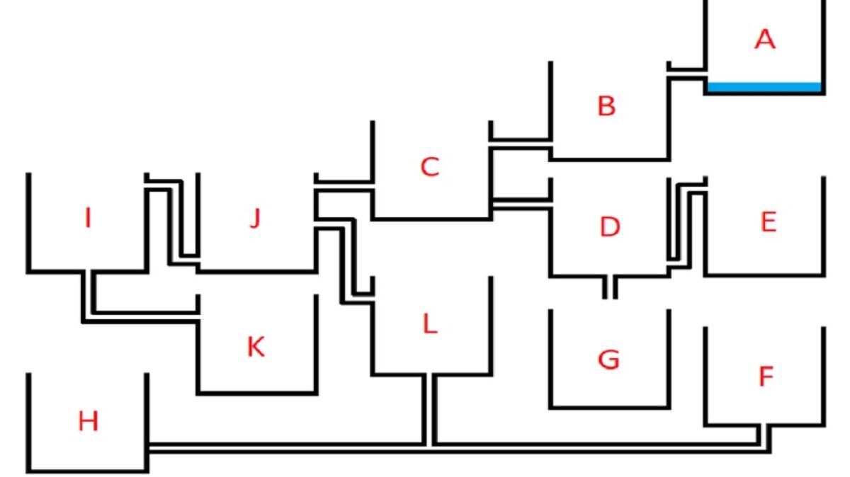 Parece fácil, pero no muchos llegan a la solución correcta. Para adivinar este reto viral hay que fijarse bien en las conexiones entre los doce contenedores. El grifo comienza a llenar de agua el 'A' y de este pasa al resto. ¿Qué contenedor se llena antes?