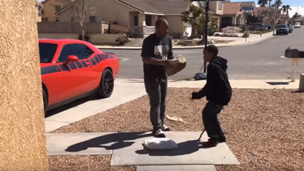 Entonces le cuenta a su hijo que tiene que destrozar su videoconsola y le da un palo para que la golpee. Al ver que el niño no lo hace con fuerza, coge una piedra y se la da para que el pequeño la tire mientras él le repite que golpee el aparato.