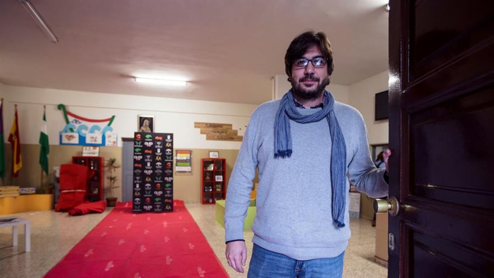 Es José Miguel Santos, un docente que no ha dejado pasar la oportunidad de reutilizar la alfombra roja de la gala de los Goya para actividades con sus alumnos después de encontrarla en un contenedor.