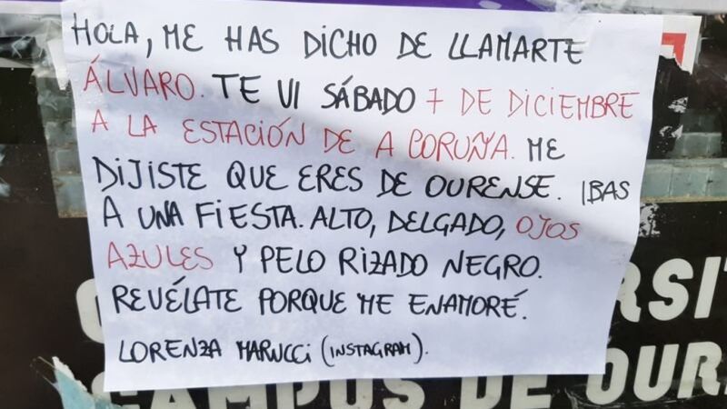 "Hola, me has dicho de llamarte Álvaro. Te vi sábado 7 de diciembre a la estación de A Coruña. Me dijiste que eres de Ourense. Ibas a una fiesta. Alto, delgado, ojos azules y pelo rizado negro. Revélate porque me enamoré", decía el mensaje que la joven Lorenza Marucci publicó en el tablón de anuncios de la biblioteca Rosalía de Castro, en la Universidad de Ourense.