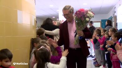 Los dos emocionados profesores llevaban un ramo de flores que los alumnos les habían regalado. Desde este martes, dan nombres a dos aulas es este colegio, que cumple 12 años.