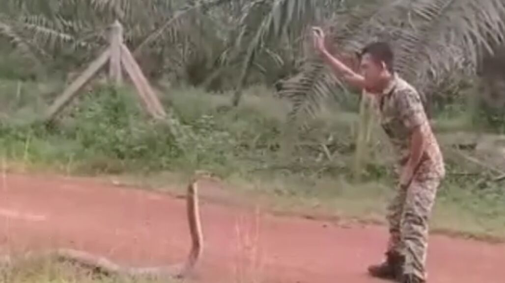 Más de uno preferiría no estar en el lugar de este soldado malayo, que se ha vuelto viral al hacerse público un vídeo en el que aparece retando a una cobra real que debió toparse por el camino.