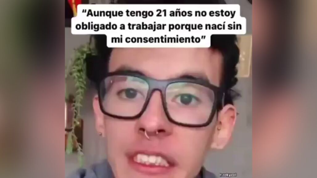 "Considero que, a pesar de tener 21 años, no estoy obligado a trabajar, porque básicamente yo nací sin mi consentimiento", afirma el joven. "O sea, mis papás me obligaron a nacer, no me preguntaron si yo quería nacer, no me pidieron consentimiento", añade, y asegura que "no tiene sentido que, porque mis papás hayan querido darme la vida hace 21 años, ahora yo tenga que trabajar".