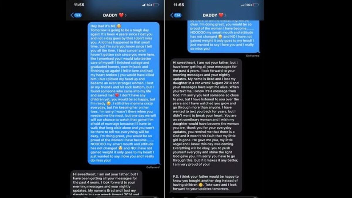 Una mujer de 23 años en Arkansas perdió a su padre hace cuatro años, pero ella siguió enviando mensajes de texto a su teléfono todos los días para contarle las cosas que le pasaban. Nunca recibió una respuesta del número, hasta esta semana.