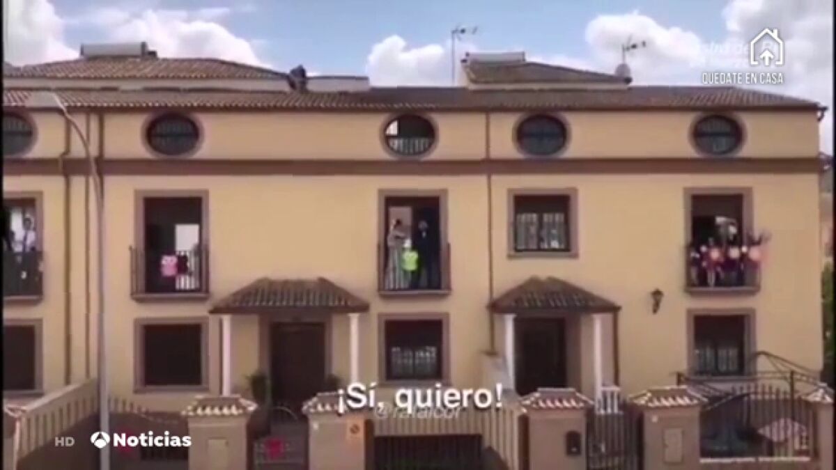 Iban a contraer matrimonio el 28 de marzo, pero el Covid-19 no les ha dejado. Aún así, salieron al balcón, vestidos de gala para celebrar mediante gritos y altavoces la boda que nunca olvidarán.