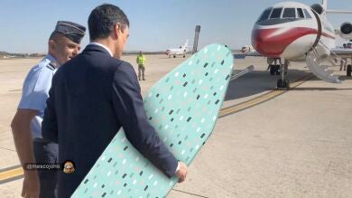 El presidente del Gobierno, Pedro Sánchez, ha sido objeto de otro llevando una tabla de planchar mientras se dirige a un avión: