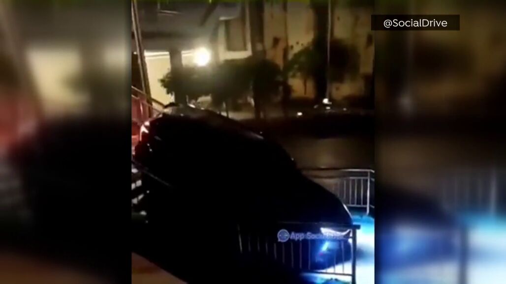 El momento en que un coche baja por las escaleras tras circular por un puente peatonal