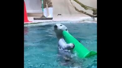 En el vídeo se puede ver cómo la nutria lleva los conos, que están en la piscina, a su cuidadora, para así terminar antes el trabajo. Mientras tanto, ella está barriendo la superficie que se encuentra al rededor de la piscina. Un trabajo en equipo.