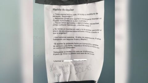 Una oferta de trabajo de un albañil en Avilés se ha convertido en un mensaje viral por su polémico título: 'Marido de alquiler'. En el cartel se puede leer una oferta de trabajo que no tendría por qué ofender a nadie si no fuese por ese polémico encabezado.