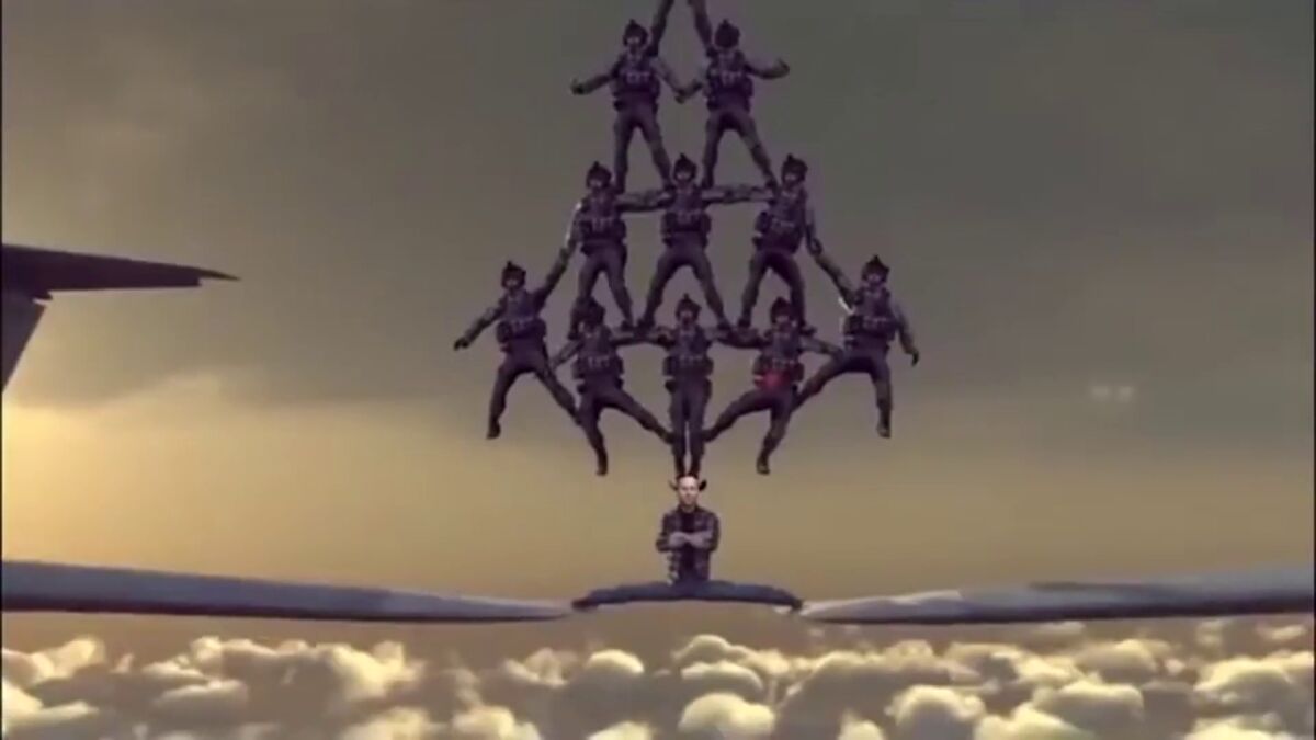 El documento se hace hasta complicado de describir. Se puede observar a un hombre, con la cara del alcalde orensano, subido encima de las alas de dos aviones y con un montón de personas encima haciendo una figura geométrica.