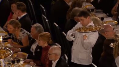 Un picor provoca un inoportuno percance: a un camarero se le cae un canapé sobre un asistente de la gala de los Nobel