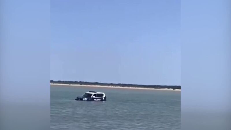 Los bañistas que disfrutaban de la playa en Sanlúcar de Barrameda, Cádiz, se quedaron muy sorprendidos con lo que vieron. Un coche de la Policía Nacional se hundió en el mar tras una persecución por la arena. El vehículo recibió un aviso de fardos sospechosos en la playa, pero quedó encallado en la arena y, al subir la marea, el agua acabó por engullirlo.