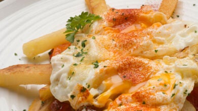 "Sirven estos huevos rotos para desayunar, comer o cenar. Se pueden encontrar variantes de este delicioso plato de huevo y patatas fritas en toda España, incluidas las islas Canarias, de donde se dice que es originario. Aunque siempre se encuentran huevos fritos poco hechos, la forma de cocinar las patatas puede variar según la región y las preferencias personales", dice el texto de la fotografía.
