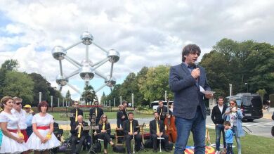 Tras Carles Puigdemont y con el 'Atomium' de fondo, una banda y unas mujeres vestidas con unos trajes regionales acompañaban al expresidente catalán en el acto organizado por la ANC.