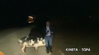 Un cerdo persigue a un periodista durante una conexión en directo en la televisión griega