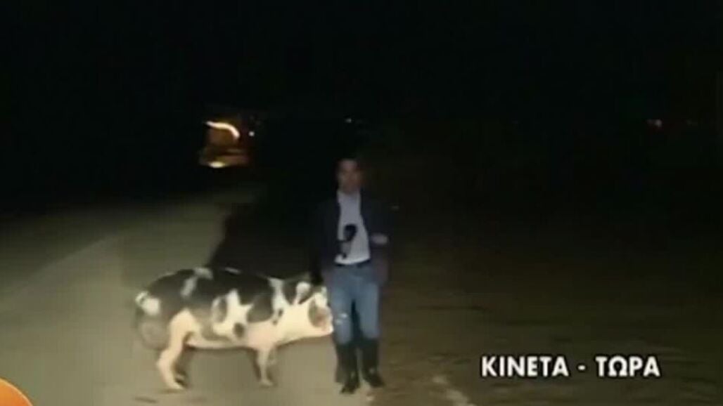 Los presentadores de un programa de la televisión griega dieron paso al reportero, que tenía previsto realizar un directo para hablar de las inundaciones que se están viviendo en el país heleno cuando aparece un cerdo en pantalla.