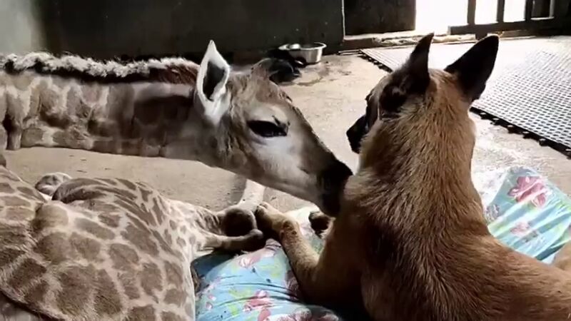 Jazz y Hunter, jirafa y perro respectivamente, han comenzado una bonita amistad después de que Jazz fuera abandonado por su madre. El perro se encarga de proteger a los animales y a prevenir la caza furtiva en el Rhino Orphagane, en Sudáfriuca.