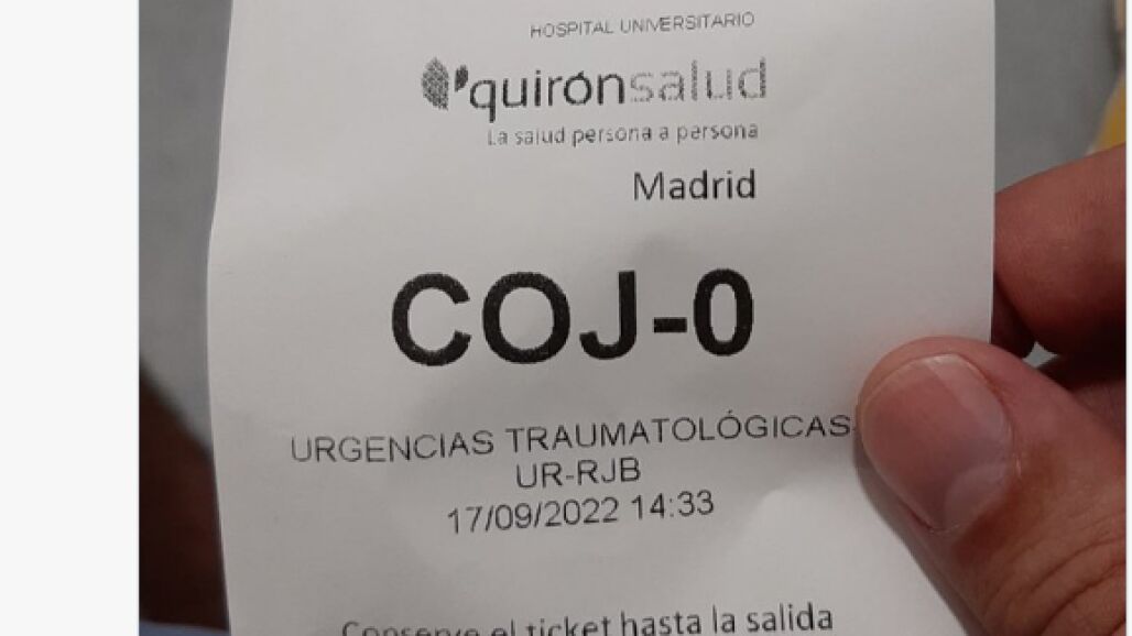 "Esguince de rodilla y los del hospital me dan este ticket", ha publicado junto a una imagen de dicho ticket. En el papel se puede leer que la referencia es "COJ-O", una combinación de letras que se expide de manera aleatoria pero que representa muy bien la dolencia con la que el usuario ha acudido al hospital.