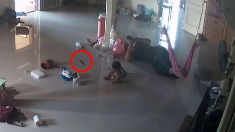 El suceso ha tenido lugar en la capital tailandesa de Bangkoky fue filmado por unas cámaras de videovigilancia. La madre del pequeño Nong estaba tumbada en el suelo de su domicilio con el teléfono móvil mientras el bebé jugaba distraído. En ese momento, un ciempiésde más de 30 centímetros de longitud avanza hacia el niño.