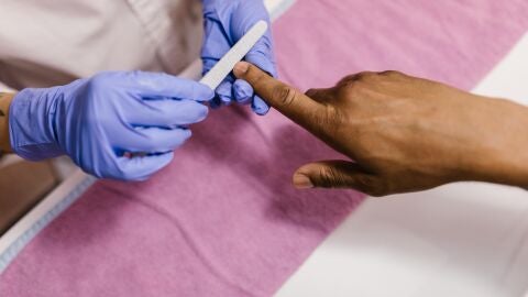El primer paso para retirar una manicura semipermanente es limar la capa brillante con una lima de grano 240.