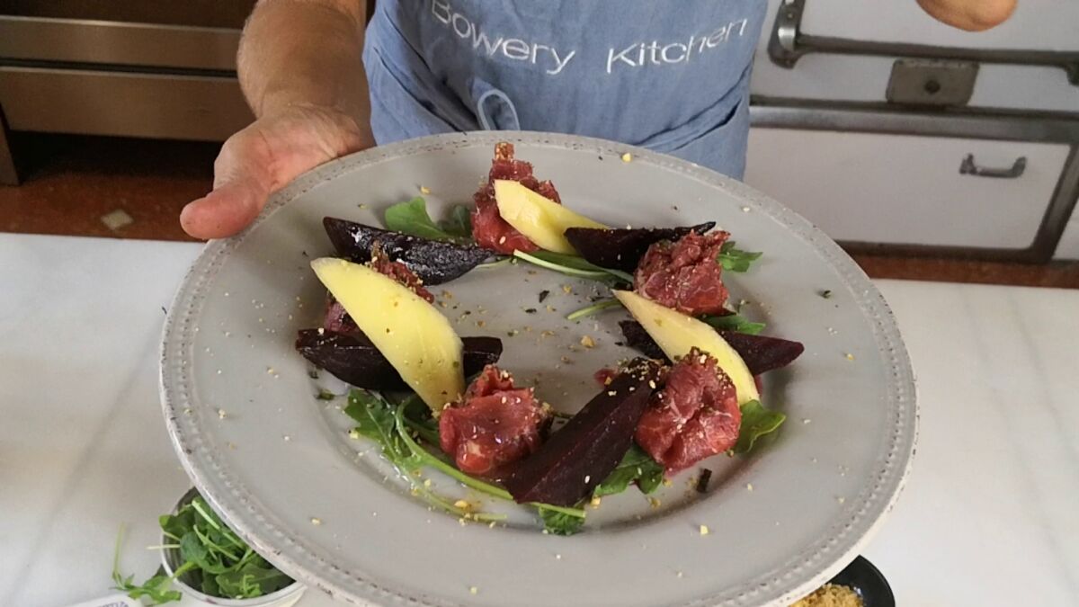 Esta semana, Bárbara Amorós nos sorprende con un aperitivo original, con mezcla de sabores y muy fácil de preparar: saquitos de carpacho con queso azul y coulis de frambuesa. Acompáñalos con unos taquitos de remolacha caramelizados, mango verde picante y un toque.