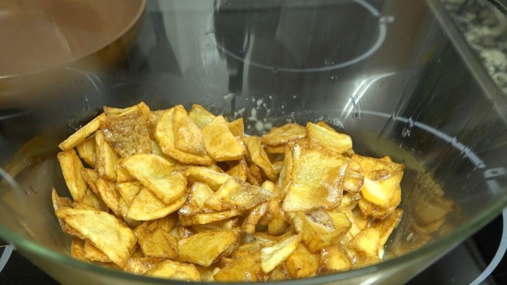 Aunque cada uno tengamos nuestra forma de cortar las patatas, lo ideal cuando vamos a cocinar tortilla de patata es hacerlo en dados de unos pocos centímetros, ¿la razón? Una vez que las hayamos freído, mejorarán mucho más la textura general del plato.